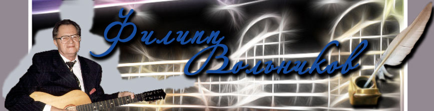 Уважаемые посетители моего сайта! Искренне приветствую вас у себя в гостях. Хочу сообщить - литературное и песенное творчество, к сожалению, не является моей основной профессией. Но сейчас, когда у меня появилось достаточно свободного времени, я бы хотел предложить исполнителям своё сотрудничество в деле подготовки репертуара. Хочу заинтересовать издательства моими последними книгами, представленными здесь. Надеюсь, что посещение моего сайта будет для вас небезынтересным! Филипп Вольников.